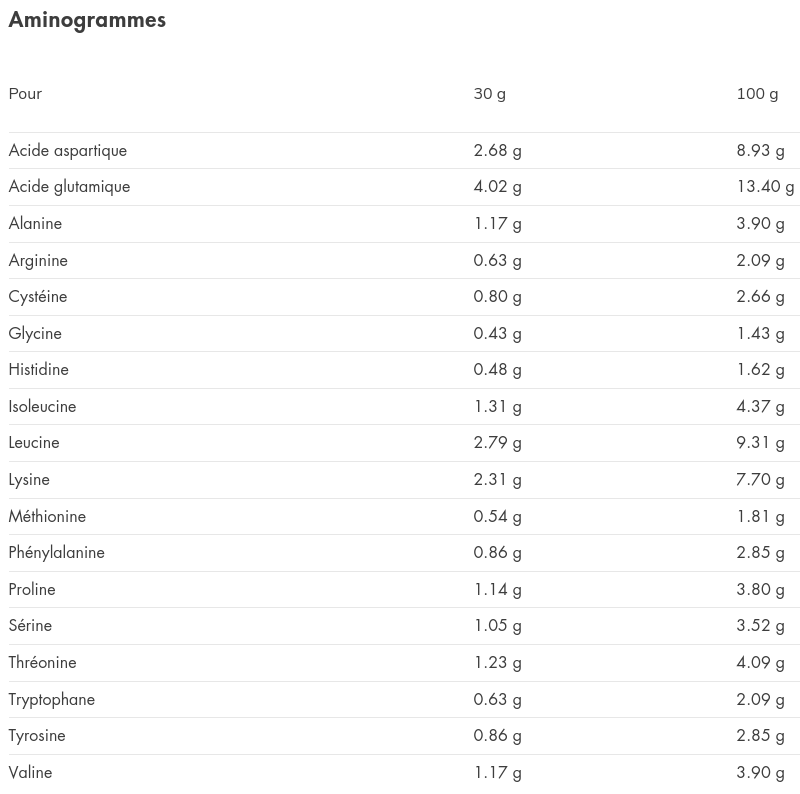 - Teneur en protéines : 75g /100g dans sa version nature (forcément un peu moins avec arômes).